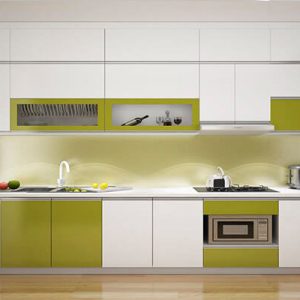 Tủ bếp Laminate được sản xuất bởi: thùng tủ từ cốt lõi xanh MFC chống ẩm An Cường, mặt cánh dán phủ lớp Laminate bằng công nghệ dán hiện đại, hậu tủ alumi cách ẩm.